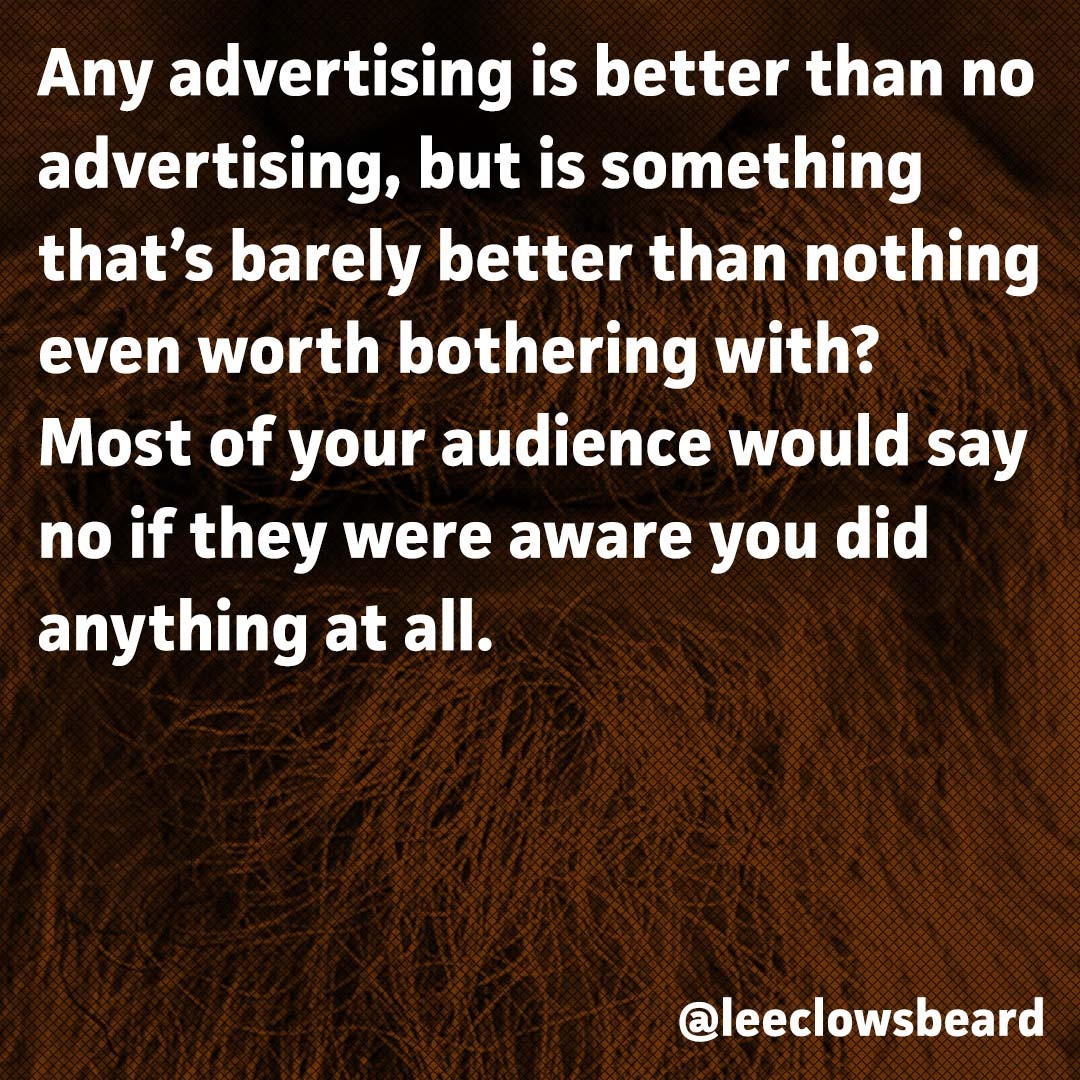 Any advertising is better than no advertising, but is something that’s barely better than nothing even worth bothering with? Most of your audience would say no if they were aware you did anything at all.