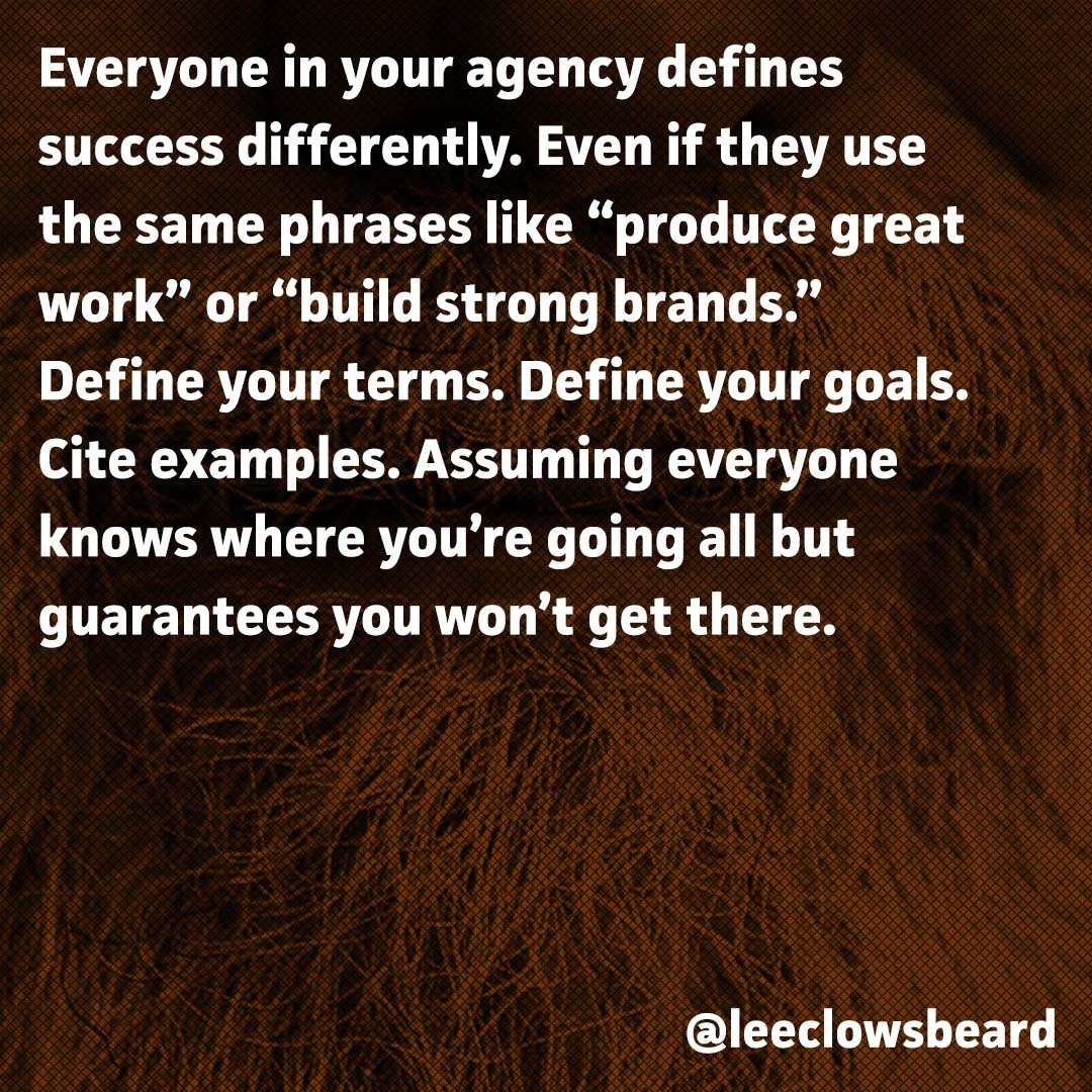Everyone in your agency defines success differently. Even if they use the same phrases like “produce great work” or “build strong brands.” Define your terms. Define your goals. Cite examples. Assuming everyone knows where you’re going all but guarantees you won’t get there.