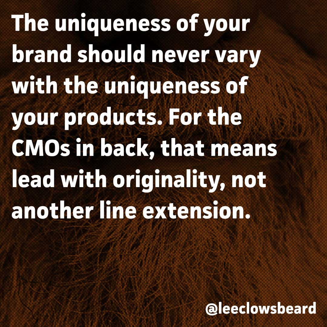 The uniqueness of your brand should never vary with the uniqueness of your products. For the CMOs in back, that means lead with originality, not another line extension.