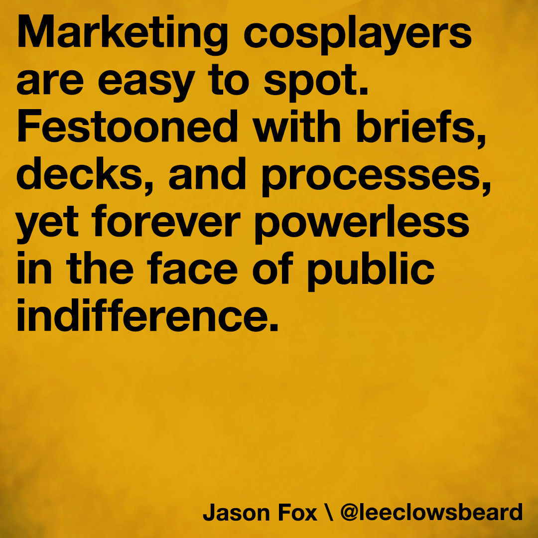 Marketing cosplayers are easy to spot. Festooned with briefs, decks, and processes, yet forever powerless in the face of public indifference.