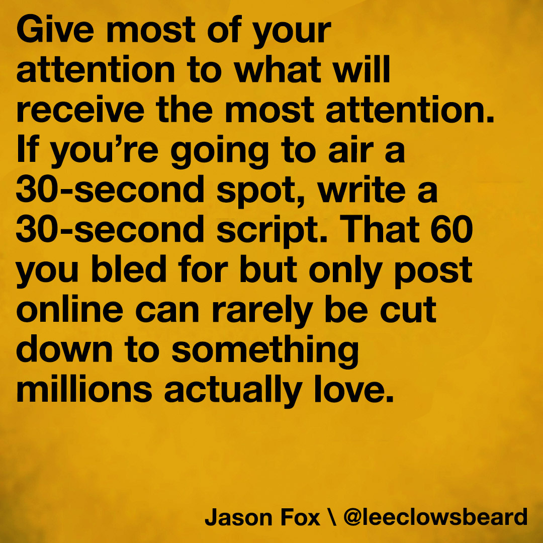 Give most of your attention to what will receive the most attention. If you’re going to air a 30-second spot, write a 30-second script. That 60 you bled for but only post online can rarely be cut down to something millions actually love.