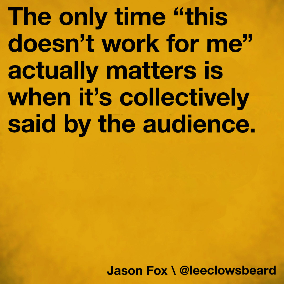 The only time “this doesn’t work for me” actually matters is when it’s collectively said by the audience.